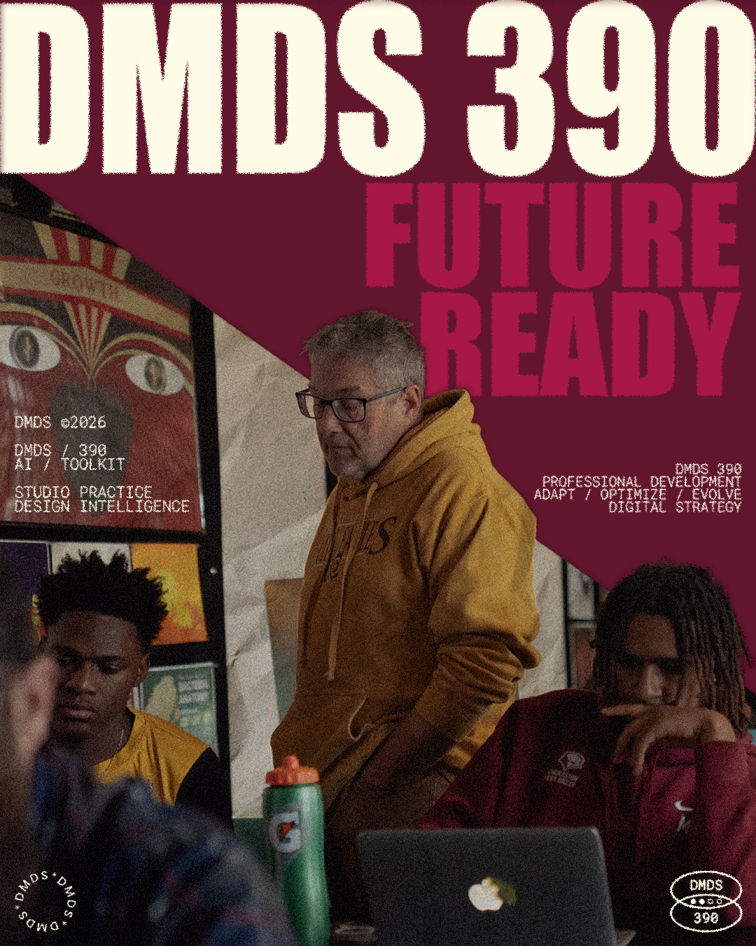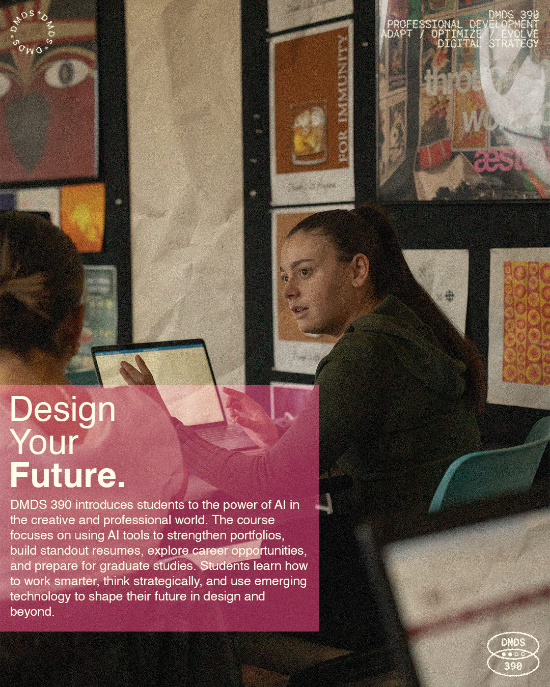 Social media design for DMDS 390, a course teaching students how to use AI to enhance portfolios, resumes, and career preparation. Focused on a clean, future oriented visual style that reflects innovation and professional growth.