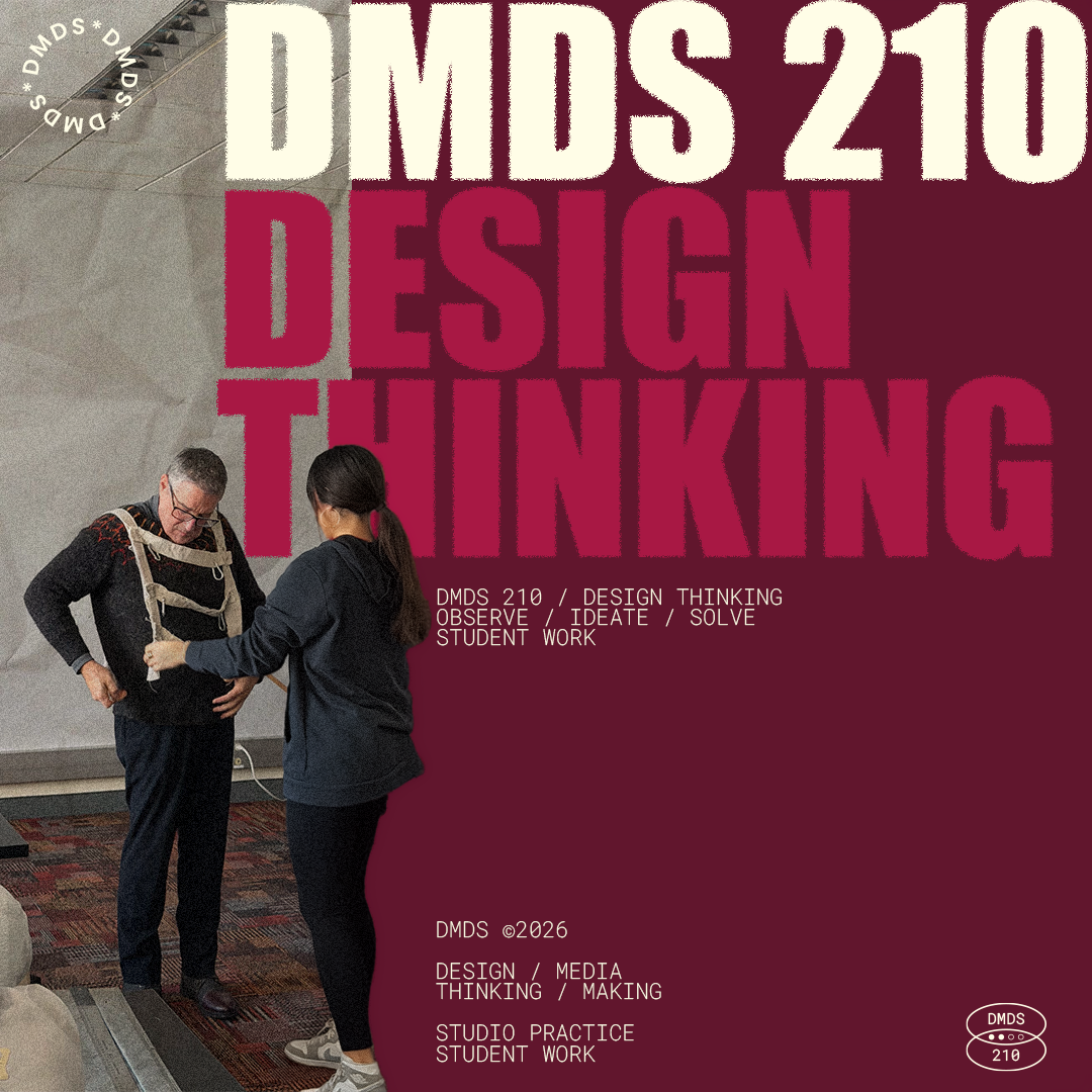 Social media design for DMDS 210, a course centered on design thinking and creative problem solving. The post highlights the process of observing, ideating, and developing solutions while emphasizing experimentation, visual research, and concept driven design.